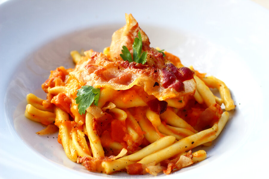Fusillo uncinato con zucca del nostro orto e guanciale croccante